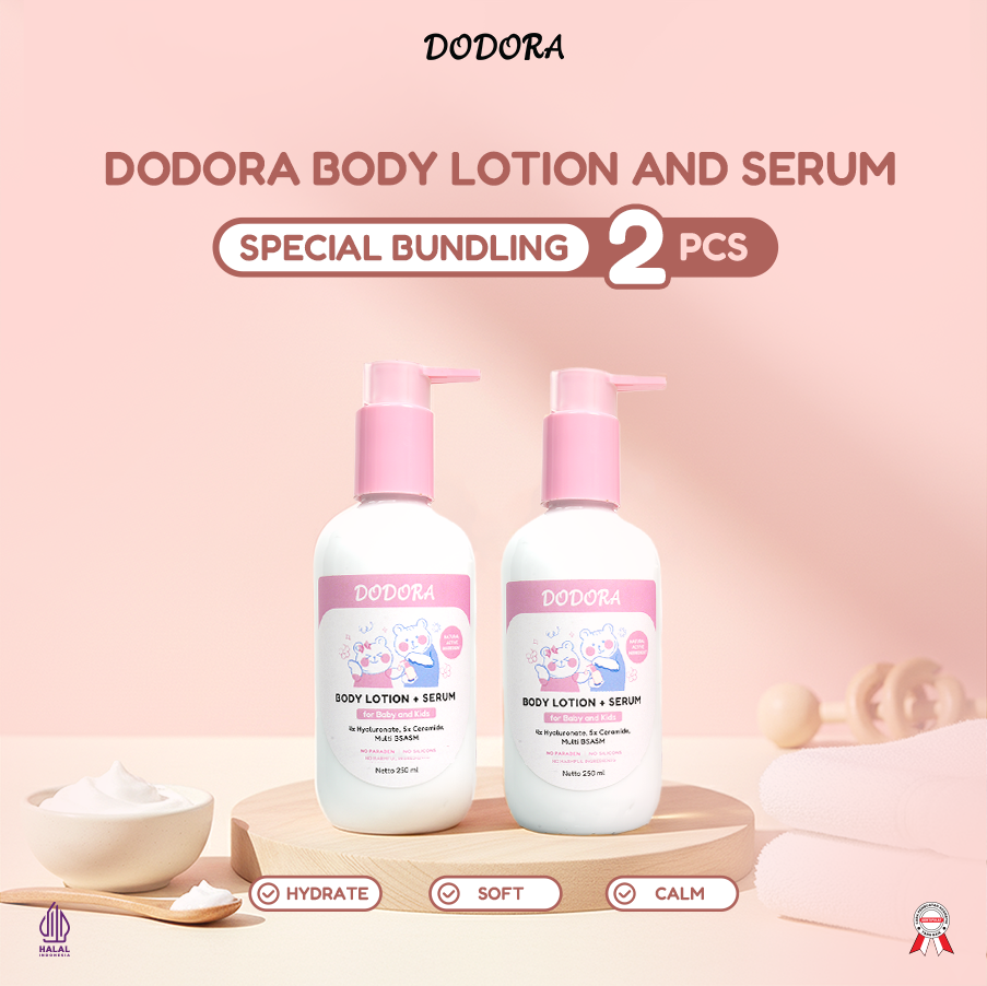 Serum Body Lotion 可以使用身体乳液。积雪草、光果甘草根提取物、茶花叶、虎杖、黄芩、洋甘菊、迷迭香。神经酰胺复合物和透明质酸复合物具有多种功效,包括、menenangkan、menentrisi 和 membuat kulit bayi dan anak halus dan kenyal。